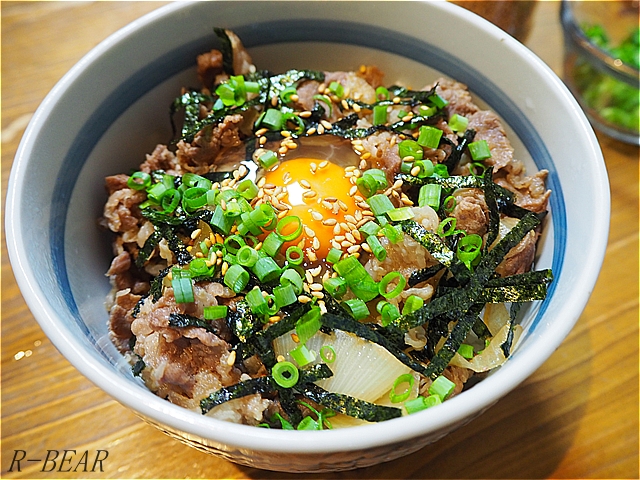 忙しいときのお助けメニュー。牛丼。今の時期の玉ねぎは甘くて美味しい。使わない手はない。生卵を割って、海苔を散らし出来上がり。今日の牛丼は優しい味の牛丼でした。