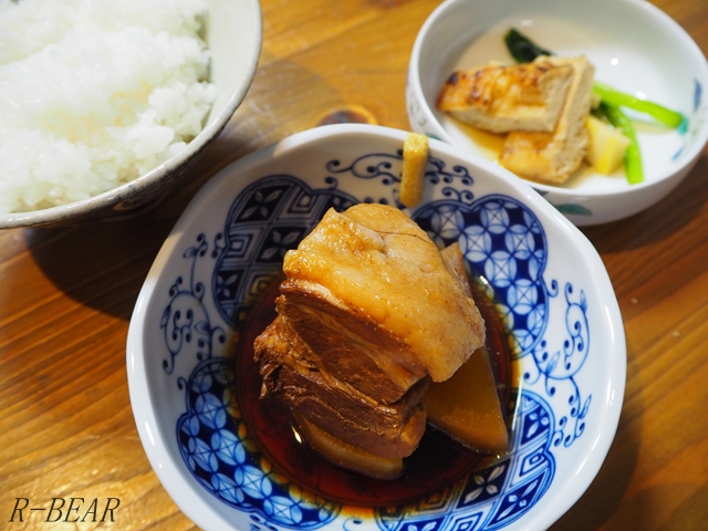 角煮を作りました。まずはブロックのままオカラでしっかり煮上げます。オカラで煮ることで余分な脂や臭みを完全に抜き取ります。一日目はこれで終わりです。そのまま一日冷やして次の日にオカラを洗い落とし、次は角煮の大きさに切って蒸し器に入れての蒸しあげです。蒸しあげた肉は大根に味をつけるために煮つけたダシをボウルに入れてその中で漬け込みます。漬け込んで味が染み込んだら大根と合わせて軽く煮つけ。結構時間がかかりますがとても柔らかく出来上がります。