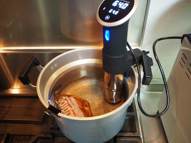 64度で10時間。レア叉焼はこれだけの設定で出来上がります。醤油やニンニクで味を付けたタレも入れています。
