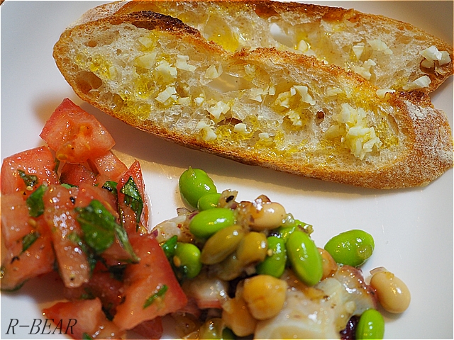 たま木亭のバケットです。合わせているのは大豆とひよこ豆、タコのサラダ。トマトのブリスケッタ。そしてナポリタン。食べたかったのです。ナポリタン。(笑)
