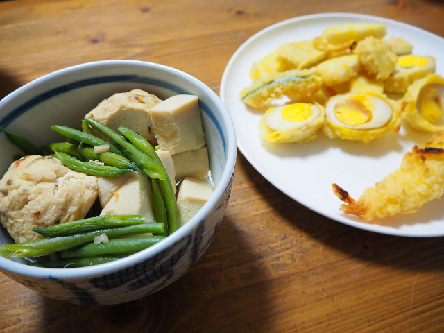 付け合わせには飛龍頭の炊き合わせと出来合いの天婦羅。