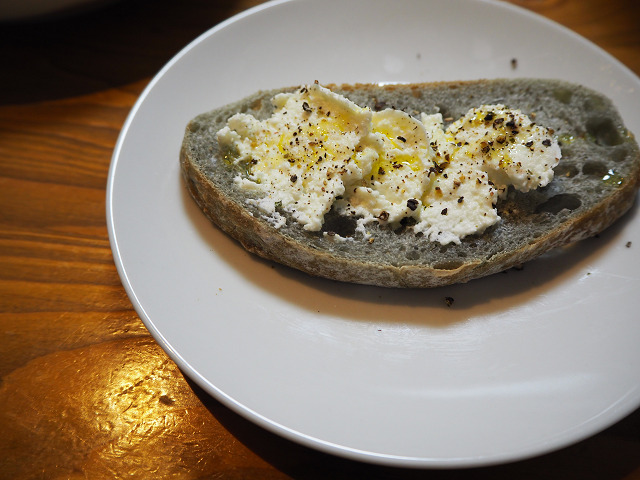リコッタチーズに塩胡椒、オリーブオイルを振っています。