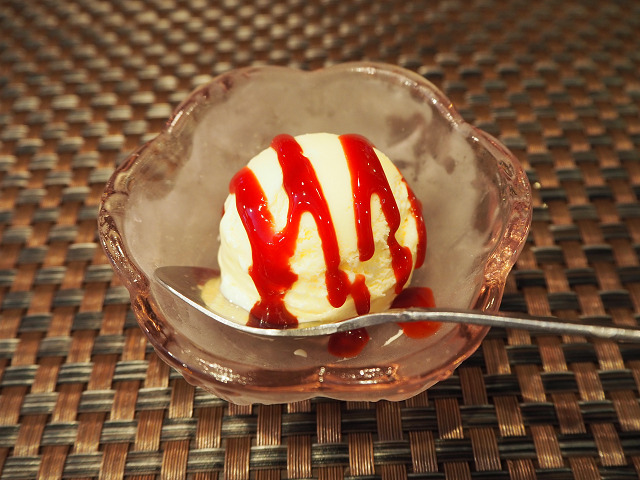 ラズベリーのソースのかかったアイスクリーム。これは営業用のアイスですね。(笑)