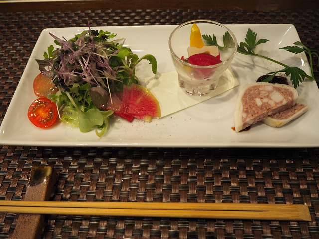 ヤマトポークのテリーヌ。5種のピクルス。グリーンサラダです。