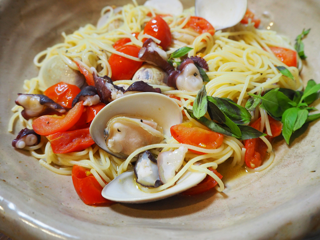 今回作ったのは千葉県産の蛤と、北海道産の水ダコを使ったペペロンチーノです。