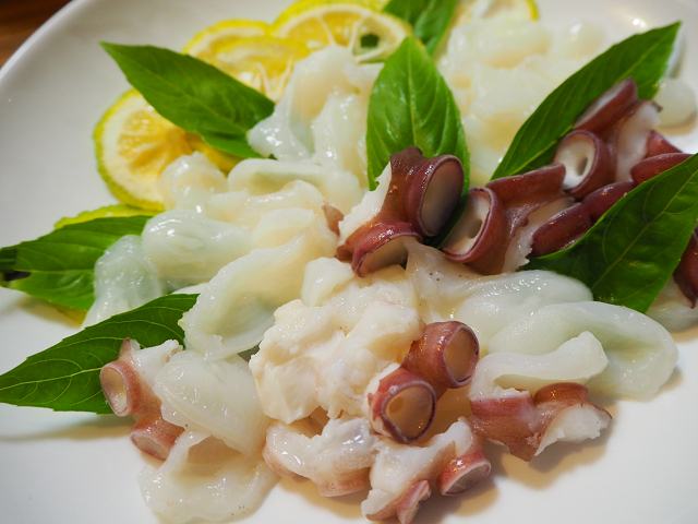 本体は生のままですが、皮と吸盤は塩ゆでして食感の違いを味わいます。