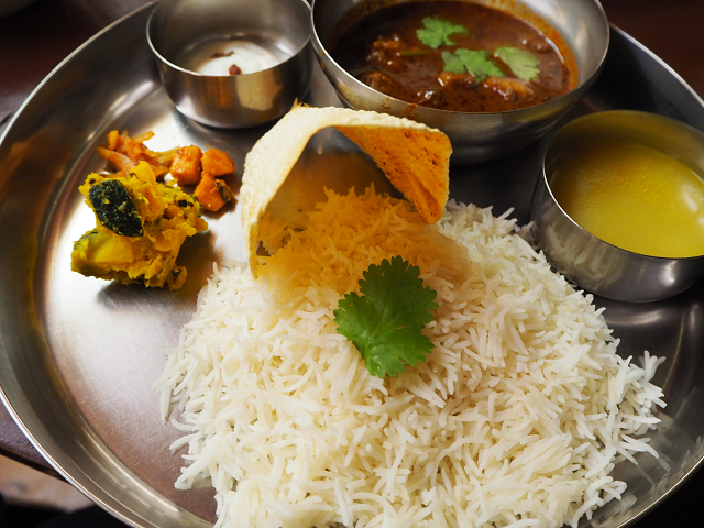 メインはライスをバスマティーにチェンジしたアーンドラマトンカレーです。