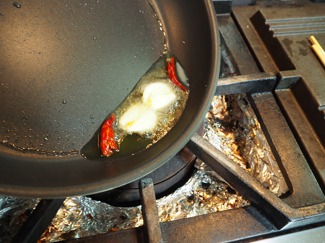 オリーブオイルをフライパンにひいて、ガーリックと種を除いた唐辛子で香りを付けていきます。