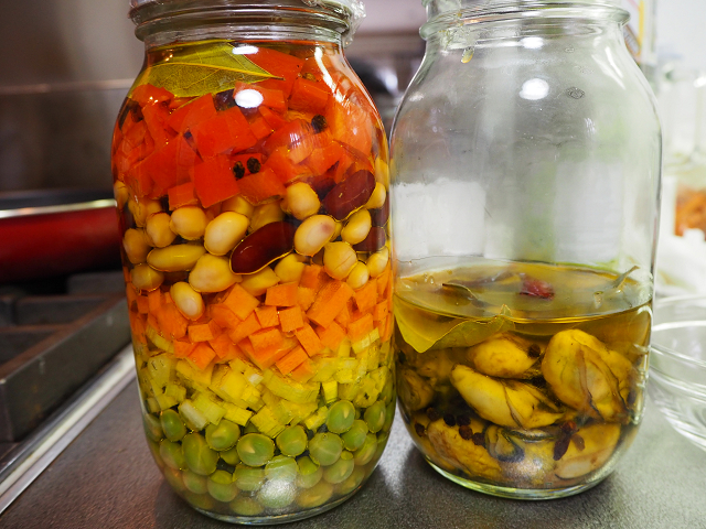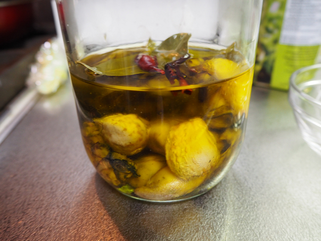 ガーリックと唐辛子(先ほどのものです)、そして月桂樹、ブラックペッパー、クローブが入っています。
