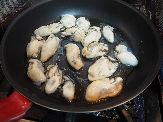 あらかた水分が飛んだら、ここでオイスターソースの投入。