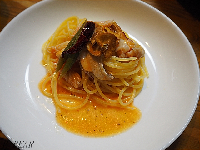 漁師風魚介のペペロンチーノ、ちょっと細めのスパゲッティーニで。