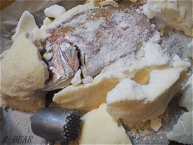 卵の白身で塩を練って鯛を覆いつくすだけです。