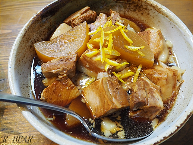 これは角煮用に先日米ぬかで煮た塊のバラ肉を切ったものです。