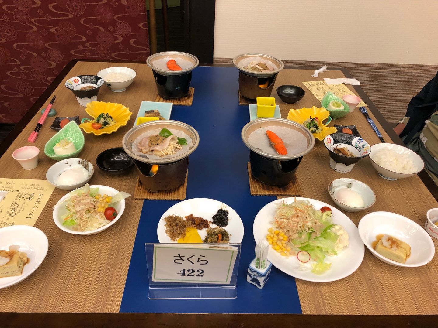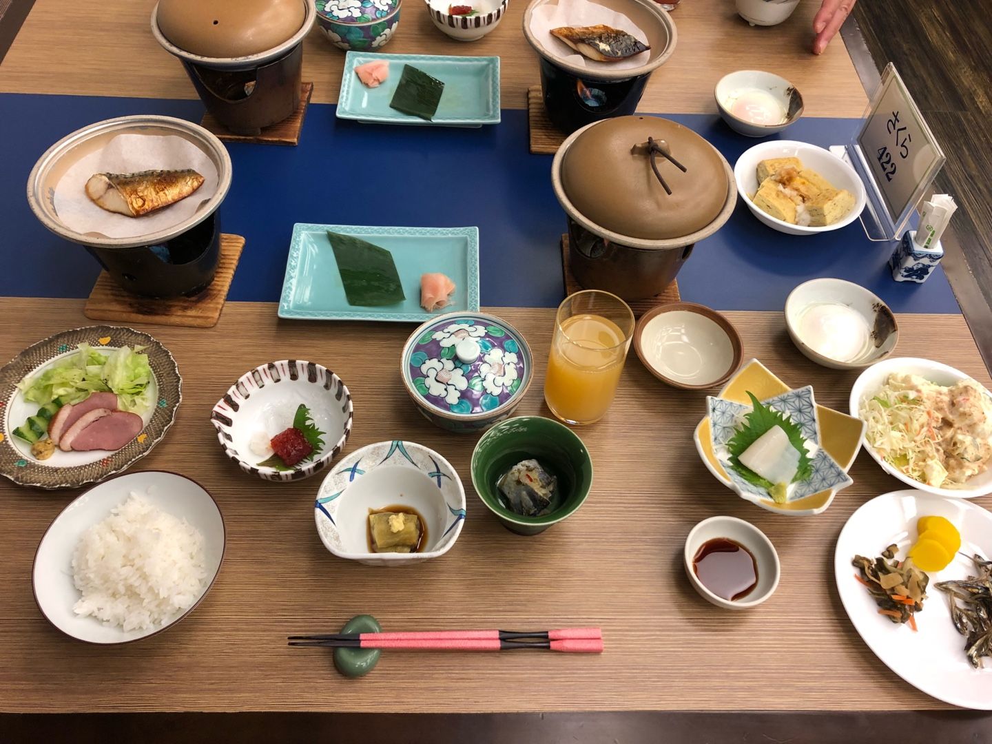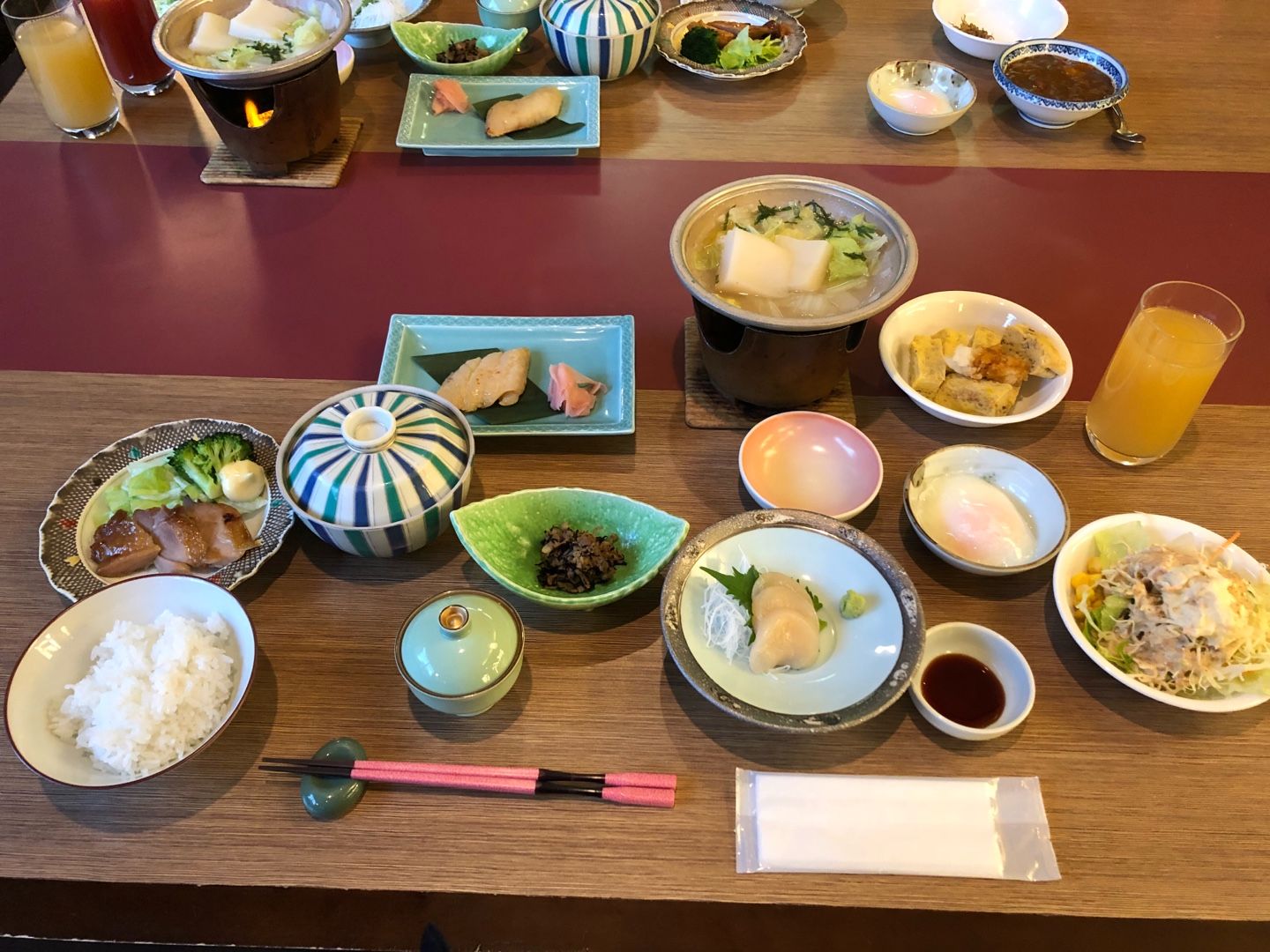 朝食は基本膳のほかにバイキングもあり、とにかくやたらと選べて美味しいです。リンゴジュースは美味しいし、ヨーグルトや牛乳もあり、朝から嬉しいです。