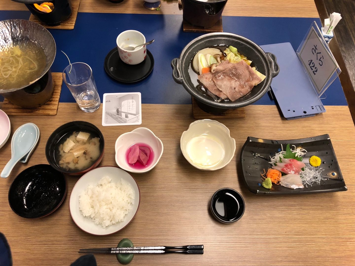 翌日、10日の朝食。旦那さんは朝からカレーです。芋煮も美味しいです。焼き魚は温かく食べられるように銅板に乗せて温めていただきます。