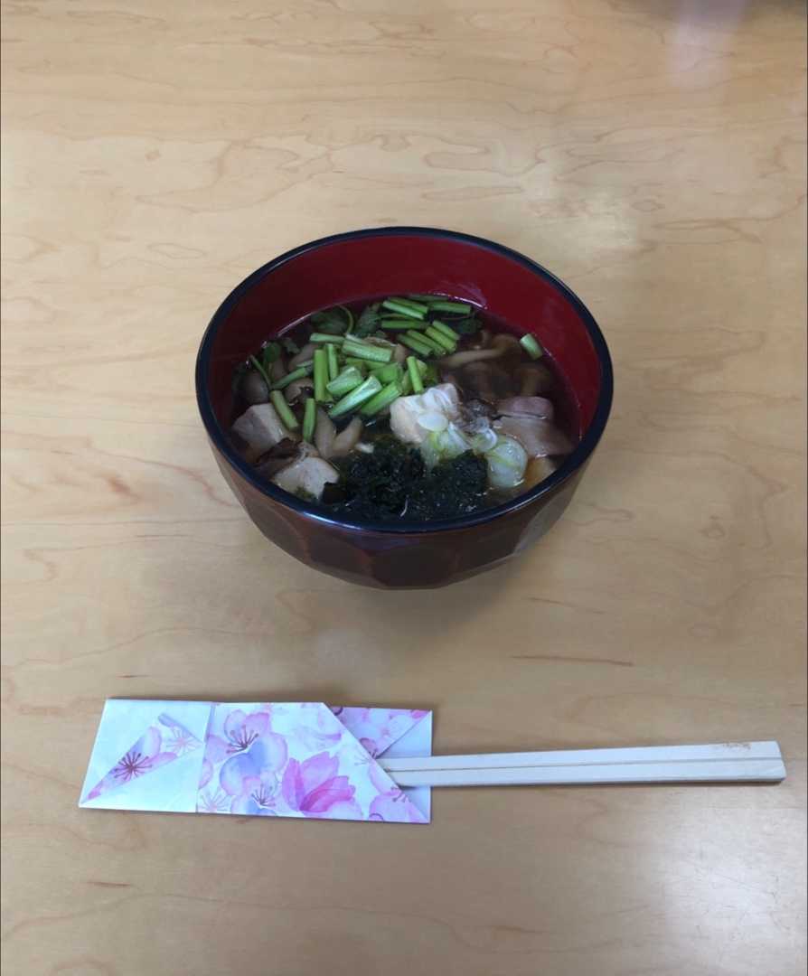 朝食の後は寝正月まっしぐらで、起きたら昼。幸せ気分で食堂へゴー。元旦のみのメニューの雑煮をいただきました。