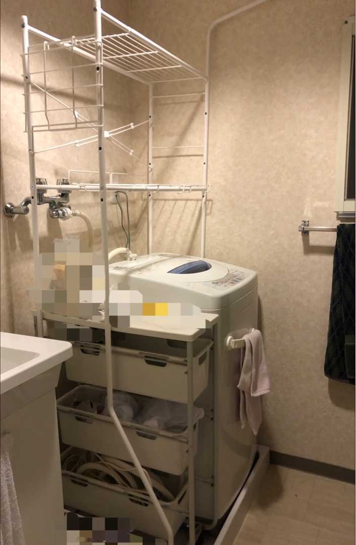 ちなみに転居前の住まいの洗面所の洗濯機置き場の上は突っ張り棚が使えたのですが、ここは無理でして、さりとて広いので、おまけに窓有りなので助かります。