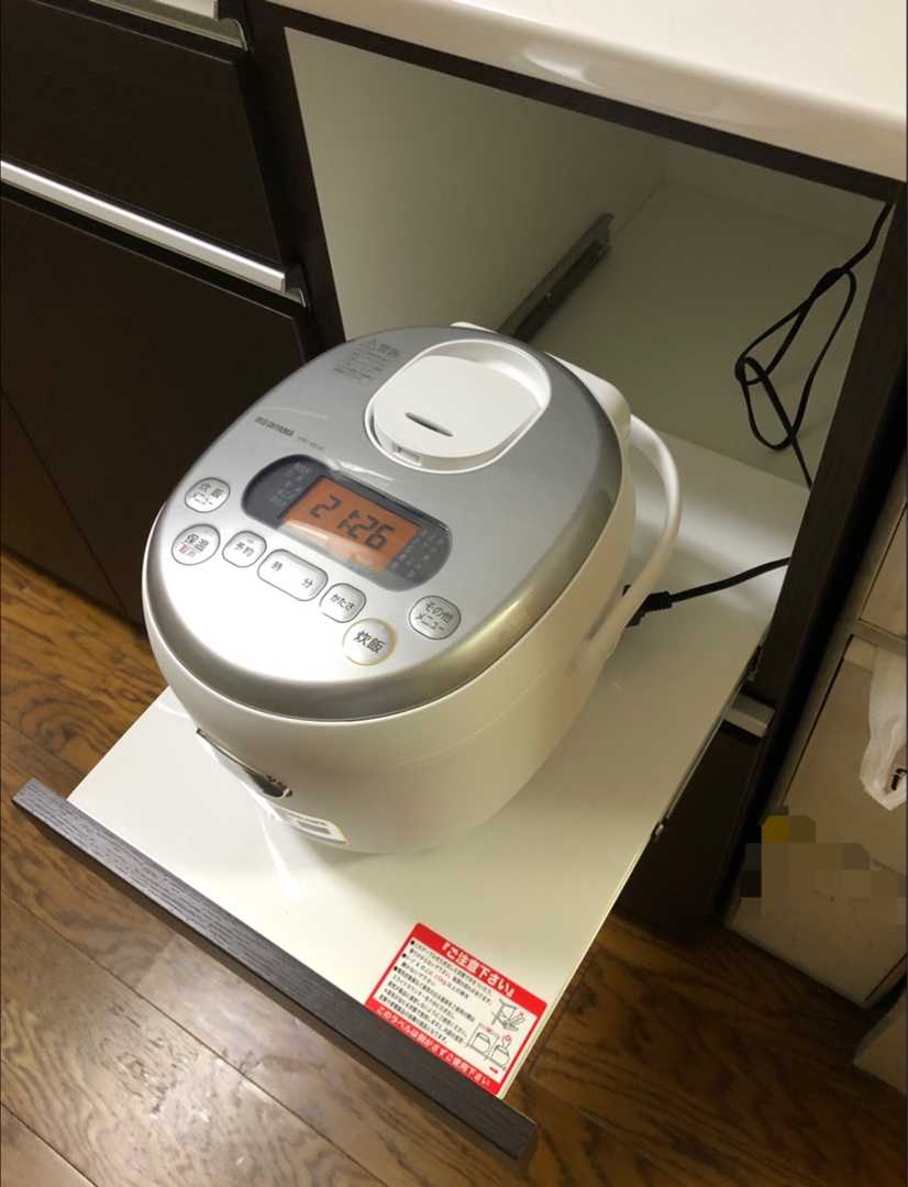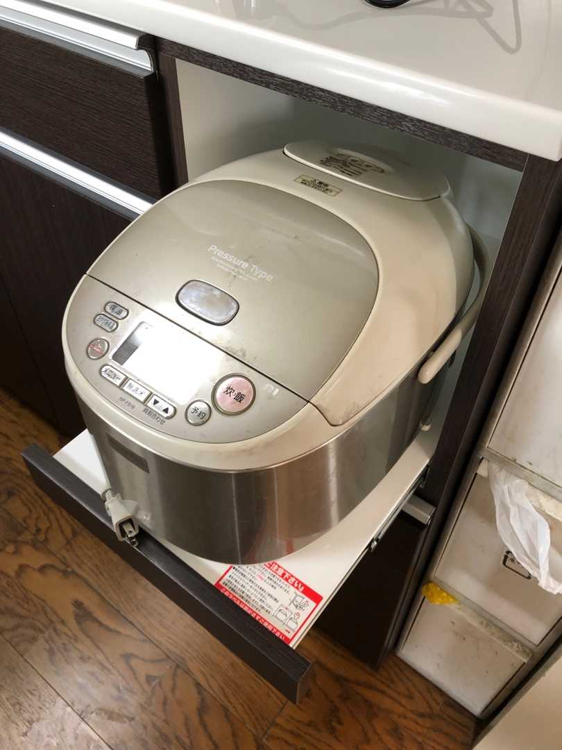 下段の右上には炊飯器用のスライド台があり、早速昨日我が家にやってきた新入りの炊飯器を入れてます。