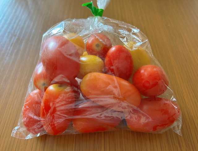 この楕円形のミニトマトは「アイコ」というらしく、ガイヘルのHさんは自宅で栽培 しているそうで、赤や黄色もあるそうです。通常のミニトマトより肉厚で甘みもあり食べやすいです。