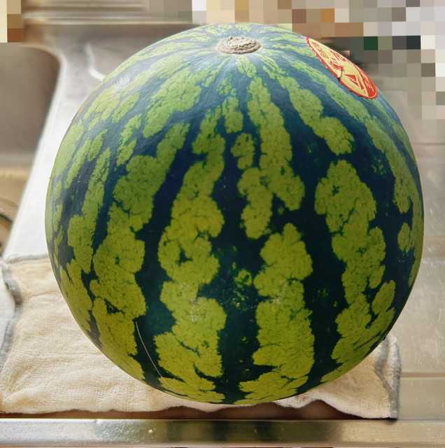 さてこれ、ここのところおやつでいただいている西瓜で、大きさの割には3.6キロと重く、割ってみたら真っ赤な色合いで、食べてみたら瑞々しく甘く、前回の小玉西瓜に続 き、これまた大当たりです!