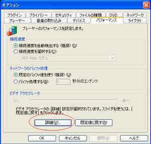 gyaoに登録した。さっそくGEORGE HARRISON AND FRIENDS 「コンサート・フォー・バングラデシュ」をクリックしてみたところ、WINDOWS MEDIA PLAYERの調子が悪くて音は聞えるものの緑色の画面が映るのみ。自分のパソコンの中にある動画は再生できるのでストリーミングだけに問題が発生しているようである。gyaoのテストページやFAQに書いてあることも試してみたが解決しない。「WINDOWS MEDIA PLAYER」をキーワードに色々ググってみたが、なかなかページに行き当たらずに何日か過ぎもう半ば諦めかけていたら、ひらめいた!「gyao 映らない」でググってみよー。一発でした。しかも楽天広場の方じゃん!!この記事のとおりにやったらばっちり見えました。ありがとう。同じ症状でお悩みの方はお試しあれ。ちなみにこの方ページの画像リンクが切れているのでWINDOWS MEDIA PLAYERのオプション設定画面を張っておきます。↑詳細設定のボタンをクリック↑ビデオアクセラレータ設定の「ビデオ ミキシング レンダラを使う(V)を使う」のチェックを外す。