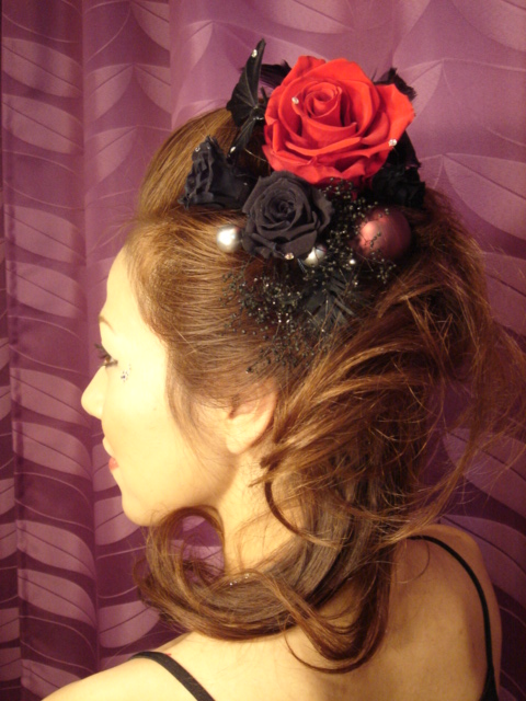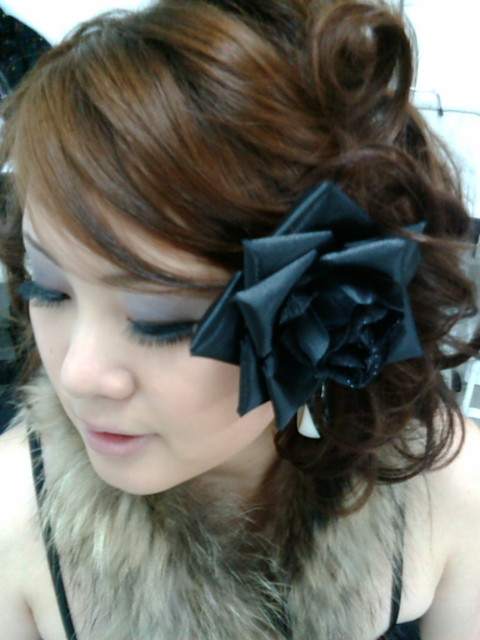 【ゴージャス】 をテーマにしてのヘアメイクですっ♪メイクは、ゴールドをメインにつかい、目元を強調するメイクにしました。目じりには、つけまつげをつけ横の長さを強調しています。(面長な顔の方は、横に広げるようなメイクをしていくと、バランスがよくなります♪)髪の毛は、前髪部分にボリュームをだし、左サイドに流しています。もともとのお顔立ちがはっきりしている方なので、前髪、サイド部分もすべてピンで止め、全体的にすっきりとさせました。 飾りでつけたお花は、この日ブリザーブドフラワーをつくり、そのお花が仕上がりのイメージとぴったりだったので、このお写真を撮るときに使わせてもらいました。ブリザーブド・・・こんな使い方もできるのね♪ラストは、ポーズをつけてっ♪記念にお名前と、日付をいれてA4サイズでプリントしてお渡し致しました♪私もすっかりカメラマン気分で楽しませて頂きました♪小学生になる小さなお子さんのいるママさんですっ♪EMIちゃんどうもありがと~!
