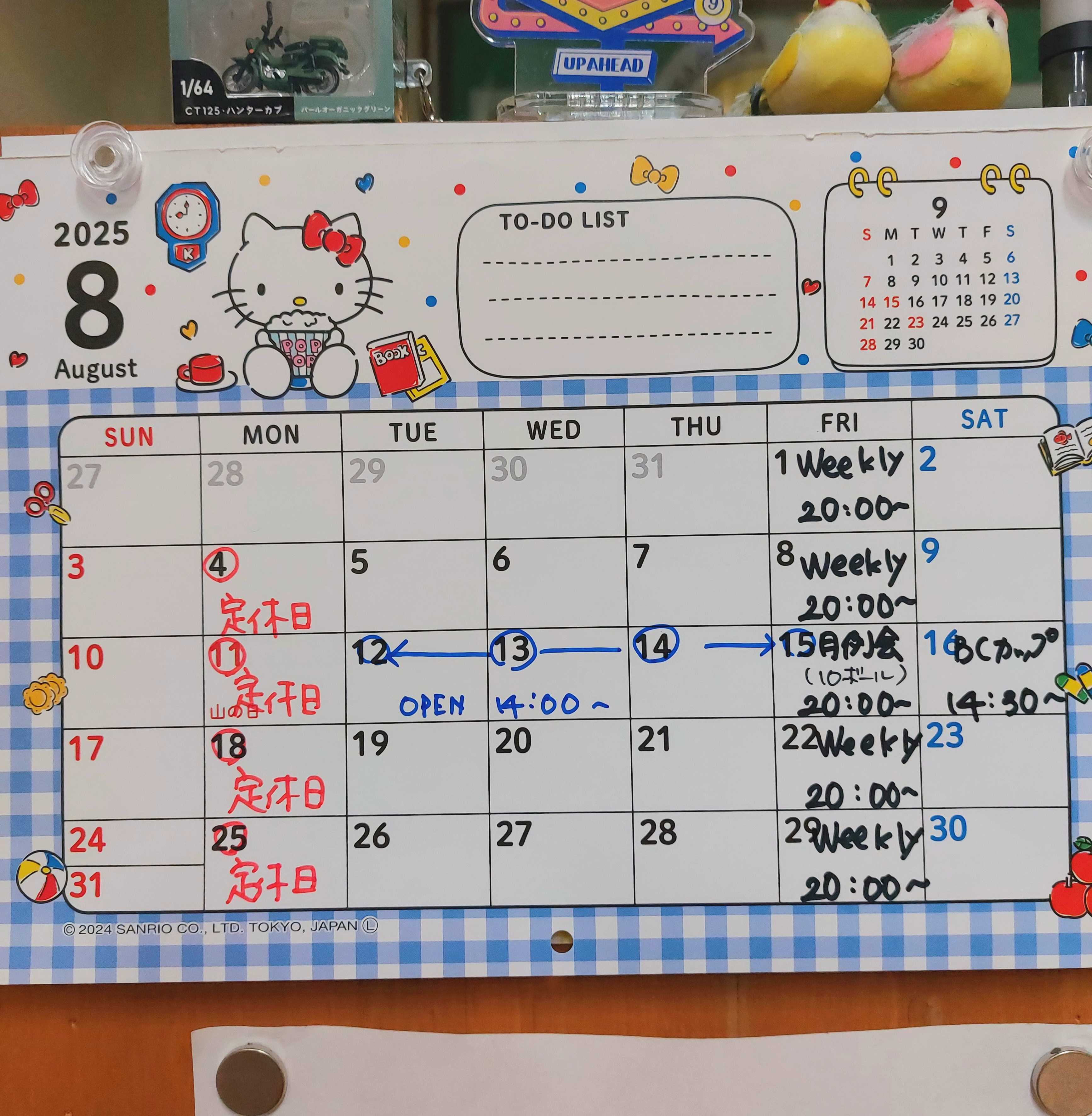 8/9(土)~8/17(日) OPEN 14:00 CLOSE 25:00 ※8/11(月)は定休日です。 ※来客状況により早じまいすることがあります。