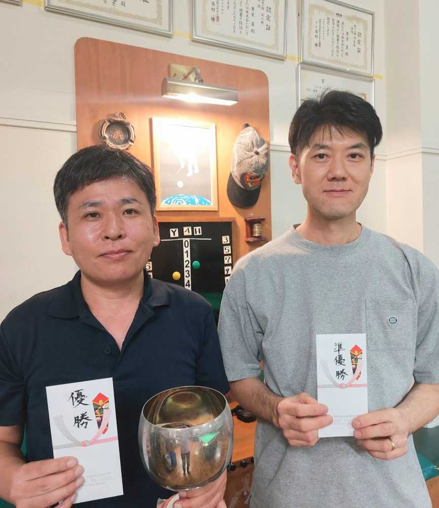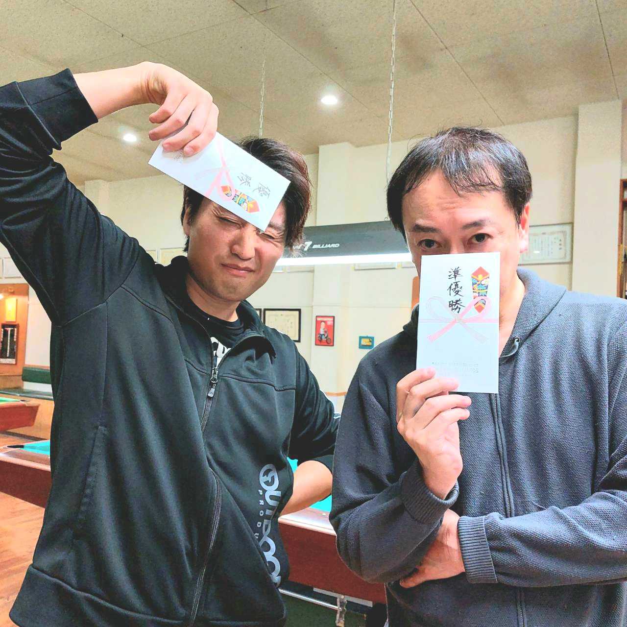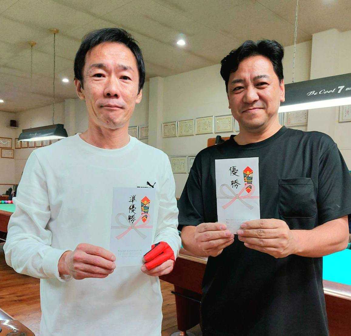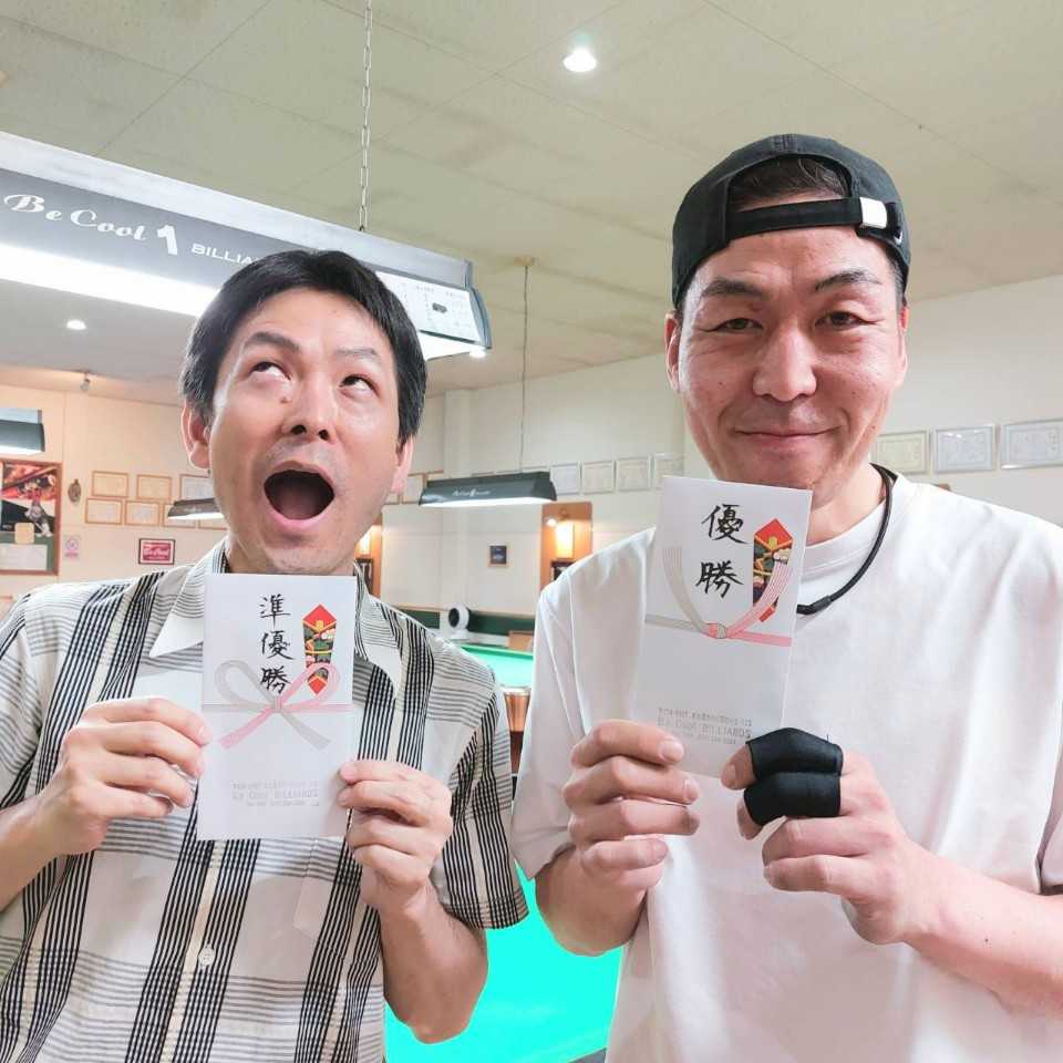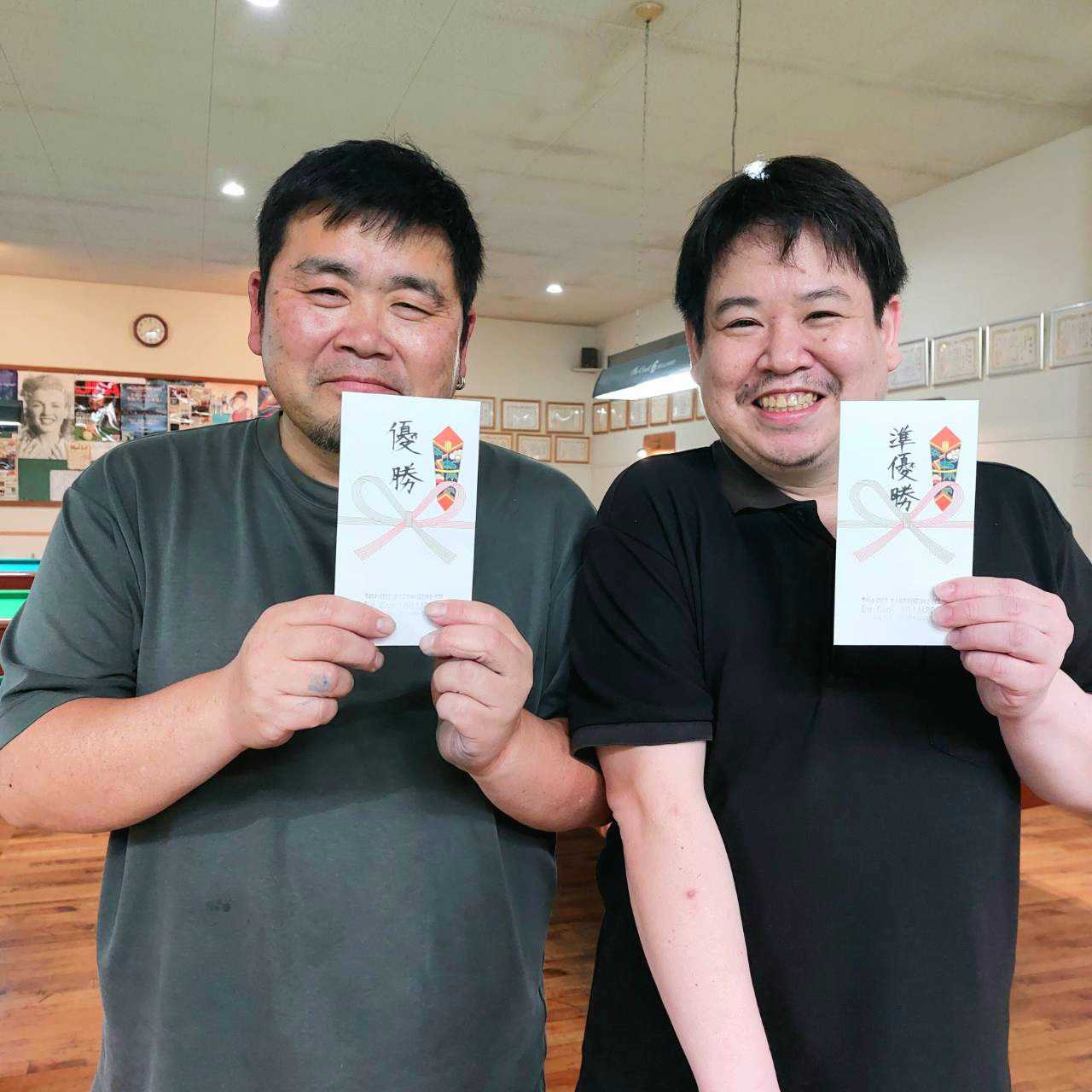 6月13日(金)に行われたウィークリーの結果です。優勝:小寺さん(A1・写真右)準優勝:黒宮(健)さん(A1・写真右)優勝は小寺さんでした♪おめでとうございます(*´▽`*)次回のウィークリーは6/27(金)20:00~です。6/20 (金) 20:00~月例会(10ボール)6/21 14:30~BCカップを開催します。みなさまの参加をお待ちしてます♪(※開催内容や日時は急に変更する場合があります。直前の告知をご覧ください。)