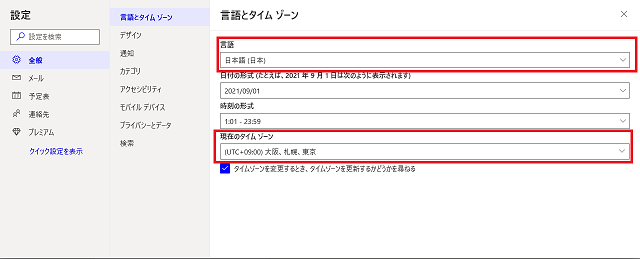 画面が開いたら、全般>言語とタイムゾーンをクリック。