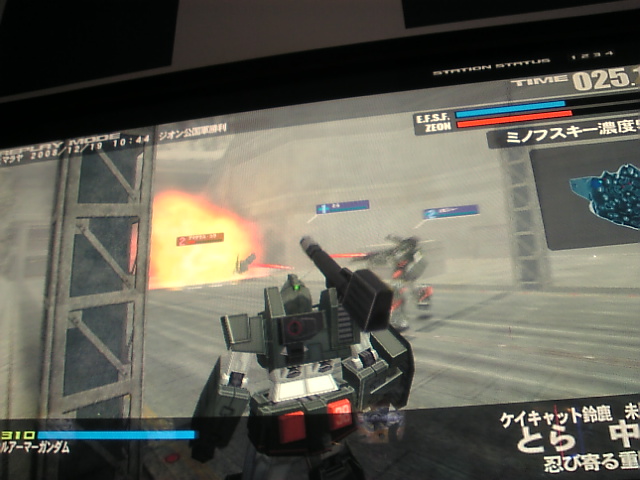 他部隊が敵機を引き付けてくれている間、ミノフスキー粒子の中をこっそり近寄った隊長と反対側から強襲をかけたとら・おにへー組が、敵輸送機『ファットアンクル』及び増援MSをその圧倒的火力で破壊します。連射が利くようになった2連装ビームライフル、超強力な誘導ミサイル、対砲撃武器であるキャノン砲が火を噴き、敵機の出撃時に大ダメージを与えます。後一歩というところで僅かに押し切られてしまいましたが、予備機体と共にファットアンクルは破壊された為、予備機へと乗り換えて強襲をかけます。