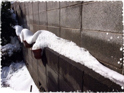 今朝、雨戸を開けると庭は一面の銀世界。庭一面に、白くてふかふかの分厚い布団を被せた様でした。昨日に引き続き娘と主人が外回り、私は門の中の雪かきを始めました。ポストへ行くにも洗濯を干すにも、雪かきをしないと何も出来ない有り様・・・。けれど、長靴も埋まりそうな雪の多さに、一体何どこから手を付ければ良いのか一時は途方にくれました。雪かきの途中、暖かい陽射しでどんどん溶けていく雪が面白い形になっているのを見つけました。なにやら私の苦手な生きものに似ているような・・・。