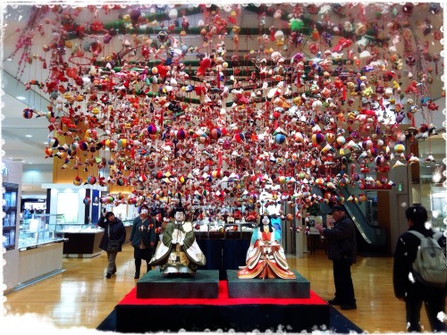 京急百貨店 三階ロビーの雛飾り( ↑クリック or タップで拡大 します )三階ロビーは、京急上大岡駅ホームからエスカレーターを上がり、改札口を出て、正面の入口を入った所に有ります。広々とした空間に、たくさんの吊るし雛。なかなか素敵でした。今年は吊るし雛の数が増えて一段とパワーアップ!吊し雛の紐の丈が長過ぎて、肝心の立ち雛のお顔がよく見えないのだけが残念でした。