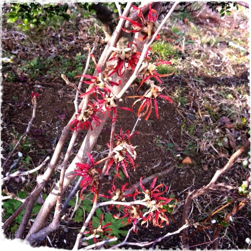 「マンサク」いつもの散歩道の脇で、今年も「マンサク」が咲いています。kugurohuさんが「マンサク」の写真を掲載していらっしゃるのを見て、この木のことを思い出して見に行って来ました。去年、散歩の途中に咲いているのを見つけた時は、未だ木も小さくて、花の数も数えるほどでした。ご近所の方が手入れをしていらっしゃる様で、一年経って少し木も大きくなり花数も増えていました。