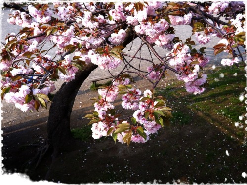 近くの公園の「八重桜」が満開でした。以前は道路に沿って五本植えられていたのですが、幹が虫にやられて切り倒されてしまい、今年は一本だけになってしまいました。ここの桜は、道路より一段低い位置に植えられているため、嬉しいことに、見上げるのでは無く同じ目線で花が見られます。そう言えば、この八重桜もいつもの年よりピンクの色が濃い様に思えます。