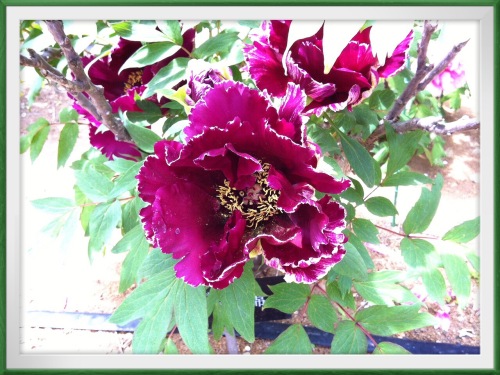 ☆牡丹園☆絞り系の椿の様な、深い赤紫色と白の縦絞りの花弁。とてもお洒落な色合いの牡丹でした。iPhoneのカメラでは、濃い色の花の微妙な色合いを写すのは難しい・・・(´・_・`)そこで、花に照準を合わせたら葉の色が薄くなってしまいました。☆薔薇園☆白いモッコウバラナニワノイバラ(ナニワイバラ)薔薇園の薔薇たちはまだ蕾。「ナニワノイバラ(ナニワイバラ)」は咲き始めたばかりでしたが、白だけでなくピンクも有りました。黄色いモッコウバラは満開。白いモッコウバラは清楚で素敵でした。