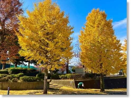 今日も午後の散歩は岡村公園へ行くつもりでした。けれど、富士山は見えそうにないし公園の紅葉は峠を越しました。銀杏の黄葉を見ようと公園とは反対の方向へ行き先を変更結果はご覧の通り大正解 \(^^)/ここは昭和50年代にできた低層(3〜4階建)の住宅団地です。建物の間隔もたっぷり空いていますしメインの通りは、道路幅も歩道も広々としています。歩道にずらりと植えられた銀杏の木々の葉が青空に映えて輝くばかりの美しさでした。