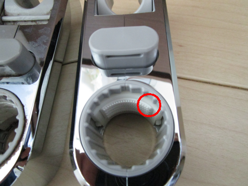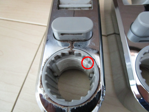 パイプを挟み込んでいるパーツの戻り(丸印)も悪くなっていました。(下が新品。)