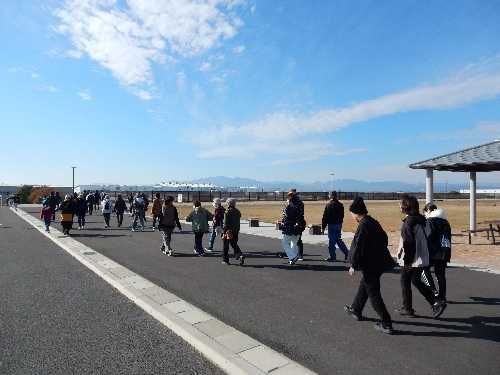 11月24日(月振休)「香良洲町体育振興会」 主催のウォーキングを、香良洲高台防災公園を中心に行いました。快晴の中、公園内の管理棟前に集合(子供9人を含め総勢39人)し、準備運動の後、まずは高台上(海抜10mに造成された)から海抜1m~5mの南→西の町内を眺め、また、松阪方面の山・青山高原の山・津方面の山など遠くの山並みの景色を楽しみました。 管理棟前から南側に向かい途中 少し立ち止まり、この地に戦時中「三重海軍航空隊」の兵舎・講堂等があったことをちょっとしたプリント(香良洲歴史資料館資料等をもとに)により説明があり、70代頃の参加者は一時(昭和30年代頃)戦後残っていた建物で小学・中学校?をすごしたり、解体後の跡地を眺めた思い出を語り合いました。高台上を北に回り、香良洲漁港側にスロープをおり、 高台 北側のスロープをおりて漁港そばの道路へ東に向かい、香良洲海岸から伊勢湾、天気が良すぎて少しかすんだ知多半田・渥美半島・神島・志摩半島を眺め、堤防側から上がれるスロープにて高台上へ!管理棟の北側の臨時駐車場を東→北 に回り管理棟前に戻り本日終了少し距離・時間としては、物足りない方もみえたと思いますが、町内ウォーキングとしては海抜1m程度~10mの高低差は初めての経験でした (^_^)/~なお、前日23日(日)は晴天の中この高台防災公園にて、「津市総合防災訓練」が400人ほどの方々が集まり、消防車・救急車・ドクターヘリ・防災ヘリも参加した大々的な訓練が行われました。また、防災に関連した団体の紹介コーナーもいくつかあり、子供も楽しめました。 消防団による消火訓練も