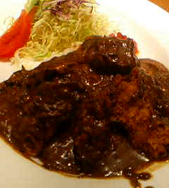 久しぶりに原宿のゴールドジムに友人と行くので、その前に麻布食堂さん(東京都港区西麻布4-2-9 鈴木ビル1F)で軽く夕飯を食べました。ここのハンバーグステーキ(\1,260)は約10年ぶりに食べましたが、最近いつも行っている下町のハンバーグ屋さんとは全然違い、上品なソースの味で、さすが西麻布のお店、恐るべしと思いました。ちなみに友人はカニクリームコロッケ(\1,260)とオムライス・デミグラスソース(\1,260)を頼みました。