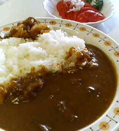 これが巷で噂の自民党カレー(\600)ですっ!国会議員の先生や秘書さん、省庁の皆さんはとても忙しいので、すぐ食べることができるカレーが好まれるそうです。私もこのカレーは大好きで本当においしいと思います。ちなみにトマトサラダは150円です。