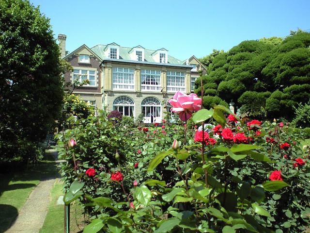 庭には、さまざまな色のバラが咲いていて、ハイカラな洋館と見事にマッチしていました。