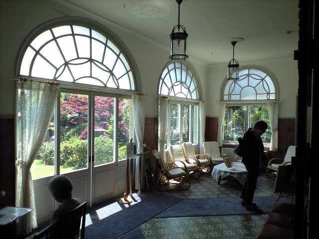 大理石の階段に敷かれた赤い絨毯を踏んで、屋敷のなかに入ります。広い廊下の右手には、広い応接室や食堂、サンルームがありました。