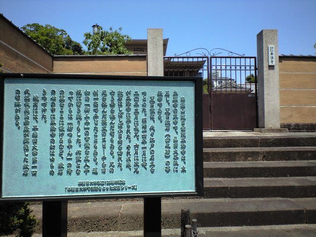 寺を出て、昔はカエルの大合唱が聞こえたという蛙坂の曲がりくねった坂道を登り、住宅街の静かな道を行くと、左に立派な石碑が建っています。