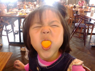 思いのほか暑くて、涼みがてら朝市の通りにある観光協会?へ。 何故か市価よりかなり安い里芋を購入し、一休み。 チビさん達はなぜか,お絵かきに夢中。 しばし休んで後は、朝市をもう一巡り。 たぶん激レアなゆるキャラっぽいのと記念写真を撮って昼御飯へ。