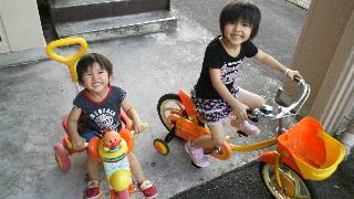 我が家の自転車軍団も今日付けで2名になったので、夕方から散歩がてら、近場にみんなでお買い物へ。 上チビさんは、もう自転車は慣れたもので、スイスイと少し危なっかしいくらいの勢いで進んでいく。 一方、今日がデビュー戦の下チビさんは三輪車な事もあり、なかなか苦戦している感じ。 とはいえ、あちこちウロウロして暑い中頑張って漕ぎ、両者満足した模様。