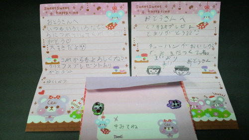 クリスマスのお礼状的なものを貰った。白菜たっぷりの中華丼も作ったのだが、冷食のチャーハンに負けた模様。悔しいけど旨いんだよなー、あれ。