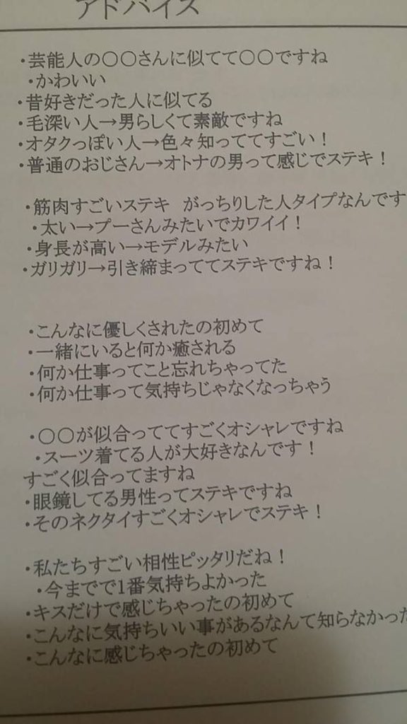 「風俗の接客マニュアル」、とされるものらしい。風俗は行ったことないから分からんけど、まあ大体のリテールバンキングもこれと大差ない感じ。よそと比べても大した商品じゃないから、営業マンの人柄で商品を買ってもらう。そこでは、お客様を不快にさせずに気持ち良くくすぐる、わざとらしくないTPOに合わせた話術ってものが必須技能となってくる。根本は一緒。でも、瞬時にそれを考えて口に出せるか出せないかは、自分の人生を快適に過ごすための分かれ道になると言っても過言ではないと思う。