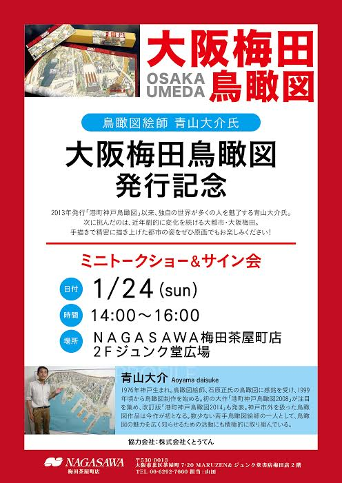 株式会社くとうてん @kutouten_book 1時間1時間前1/24(日)14時〜16時は、ご予定はお決まりですか?「大阪梅田鳥瞰図2013」発行記念ミニトークショー&サイン会が梅田のNAGASAWA梅田茶屋町店であります。←MARUZEN&ジュンク堂書店梅田店2階制作秘話をミニトークでどこまで語り尽くせるか!? 乞うご期待♪ (岩)NAGASAWA 梅田茶屋町店【大阪】 @nagasawa_umeda 1月9日大阪梅田鳥瞰図 発行記念!鳥瞰図絵師 青山大介氏 ミニトークショー&サイン会 1/24(日)14:00~16:00原画も見ていただけます☆