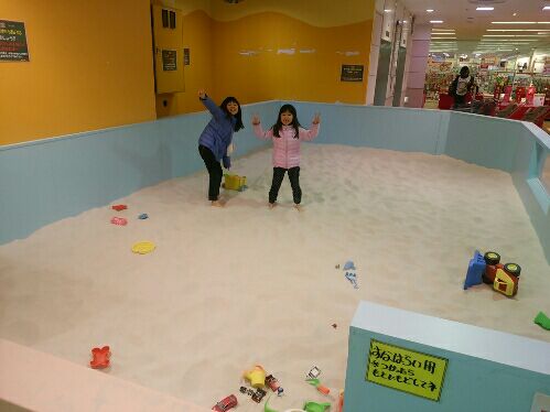 なぜだかイオンに砂場があった。 チビ達はここぞとばかり遊び倒す。 まあ、旅館に着いたら風呂くらいしか行くとこないし。 ちょっとくらい汚れても後で嫌と言うほど風呂に入るから、良しとしようか。