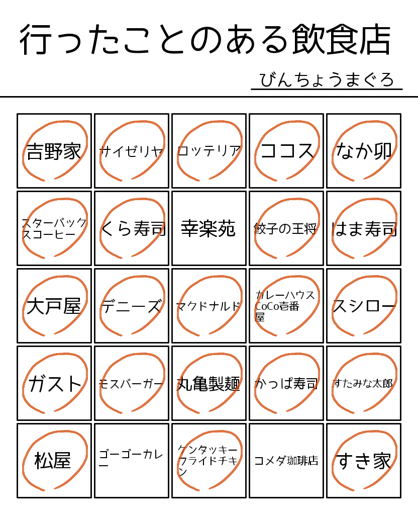 ツイッターであったのやってみた行きそうで行ってないのが残ってる。ゴーゴーカレーは北陸人として行っとかないとトマトは最近克服しつつある。牡蠣とセロリもやってやれない事はない…か?電気のひもでシャドーボクシングは、日本人男子の必須科目。ていうか、今でもやってる。※ここから女性は立ち入り禁止意外にノーマルいろいろとあって面白い。めけぽんビンゴ